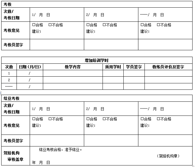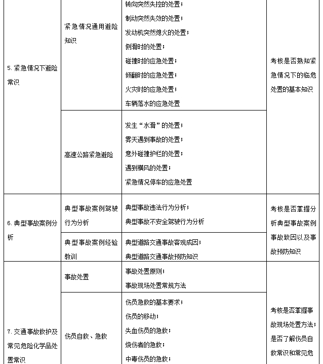 1.本大纲分为“道路交通安全法律、法规和相关知识”、“基础和场地驾驶”、“道路驾驶”和“安全文明驾驶常识”四部分内容。每部分内容培训结束后,应对学员的学习进行考核。“基础和场地驾驶”、“道路驾驶”两部分考核不合格的,由考核员提出增加复训的内容和学时建议。鼓励机动车驾驶员培训机构(以下简称驾培机构)聘用二级及以上教练员担任考核员。