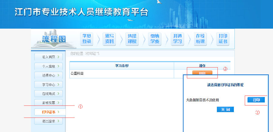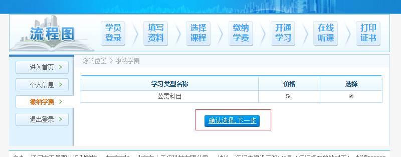 7、点击“确认选择,下一步”进入支付页面,选择适合自己的支付方式,支付成功后,选择需要开通的课程进入学习(可电脑学习,也可下载专属APP学习,页面首页有下载链接),学满18课时才可以进入考试,考试60分及以上(包含60分)即可通过继续教育学习。点击打印证书出示证明。