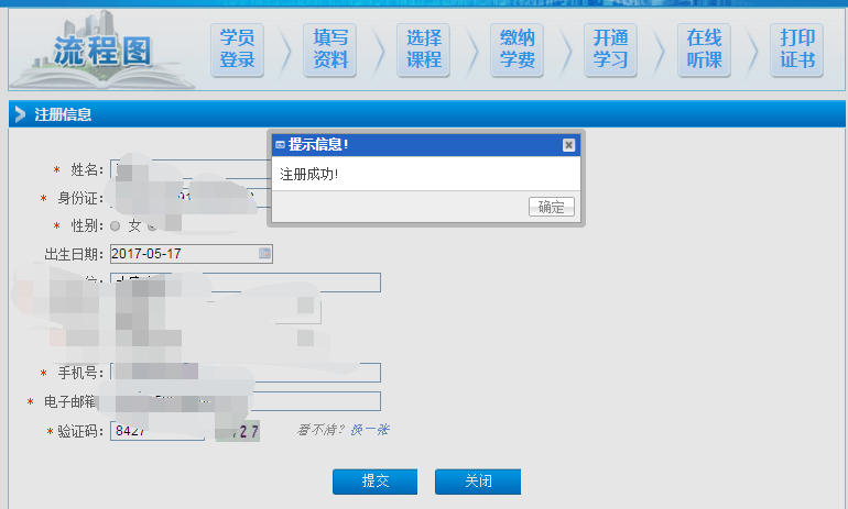 3、新注册学员,提交后进入以下页面,即注册成功。并且点击提示信息框中“确定”进入学习。
