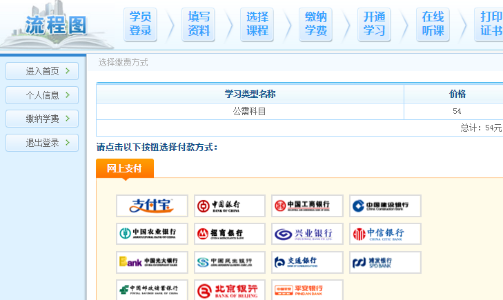 6、点击上图“缴纳学费”,进入以下页面。