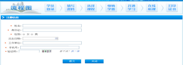 ② 未注册学员点击上图“注册”按钮,进入以下截图页面,填写姓名、身份证、出生日期、工作单位、手机号、验证码,然后点击“提交”按钮。即可完成注册。